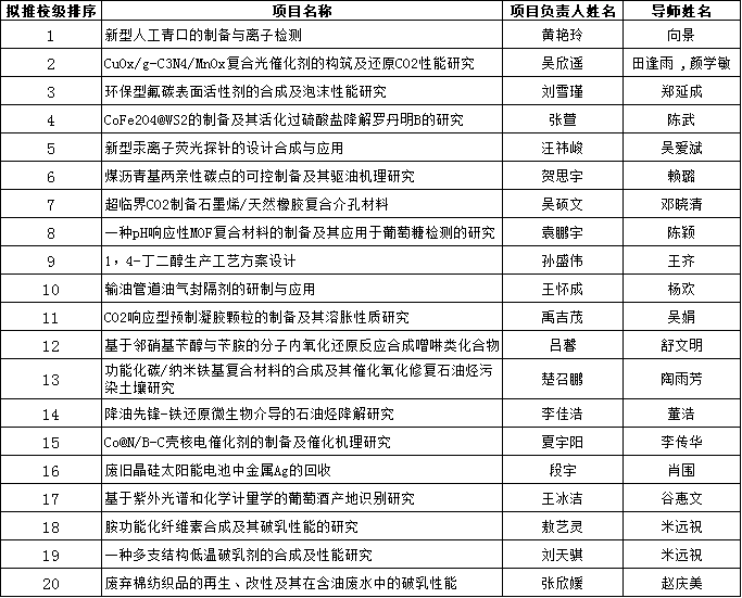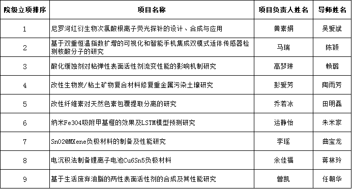 根据教务处《长江大学第十五批“大学生创新创业训练计划”项目申报的通知》要求,2022年10月6日学院组织专家对申报的30项创新训练类项目进行了评审。经过项目组学生的汇报答辩、专家评审,并结合项目申报通知要求,学院拟推荐《新型人工青口的制备与离子检测》等20项申报校级项目立项,拟立《尼罗河红衍生物次氯酸根离子荧光探针的设计、合成与应用》等9项为院级大创项目,其余1项不予立项,具体名单如下: